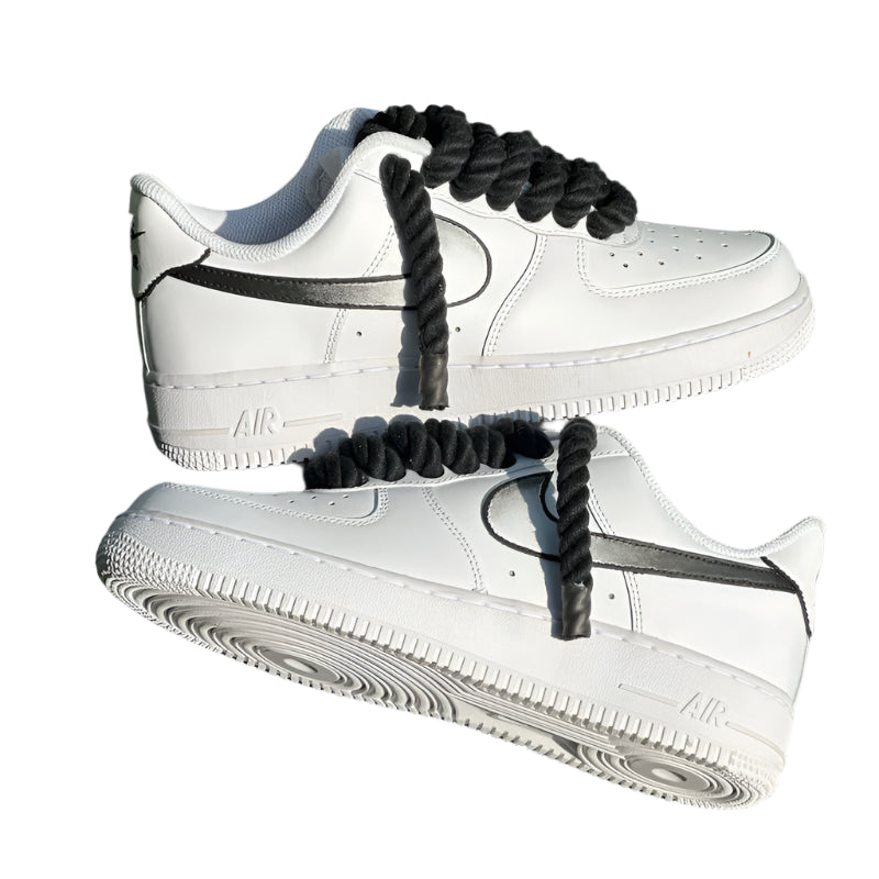 The BLACK ROPE SWOOSH AF1 features a classic NIKE AF1 design in triple white, paired with fan-favorite thick black rope laces. The black ombre accents on the swoosh add a touch of boldness to this iconic sneaker.