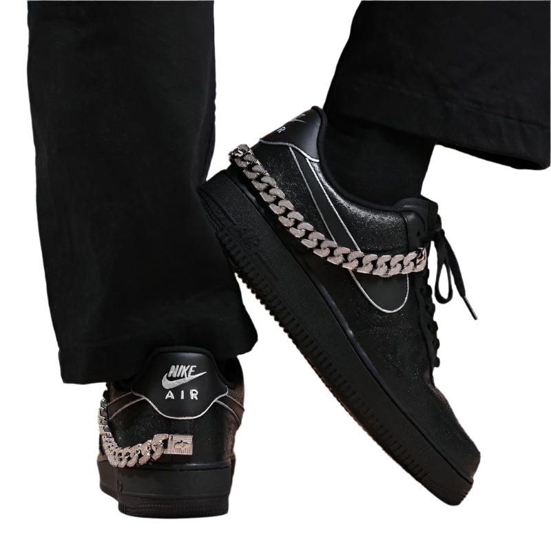 Classic black Air Force 1 covered in tuxedo black glitter and accented by silver borders on the iconic swoosh with an elegant silver pave cuban chain for a touch of opulence.