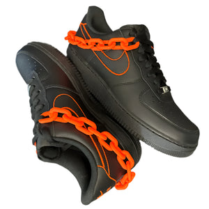 Designed for risk-takers like you, this black Nike AF1 features vibrant flaming orange accents on the swoosh and backtab. Complete the look with the neon linkup chain. Dare to stand out from the crowd and elevate your style with this bold and dynamic shoe.
