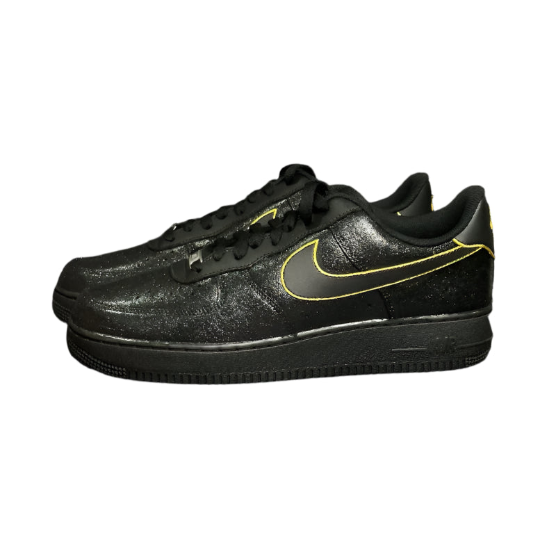 Indulge in luxury with our GOLD MOONROCK AF1. This black Nike AF1 is elegantly covered in tuxedo black glitter, accented by gold borders on the iconic swoosh for a touch of opulence.
