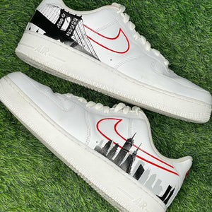 Take a bite out of the Big Apple with NYC Skyline AF1s. Hand painted NYC skyline with a red swoosh outline on the outside and drip on the inside.