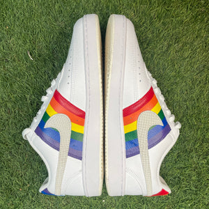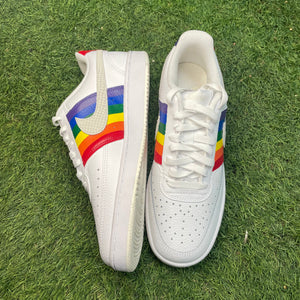 Celebrate pride in style with our custom Nike CourtVision sneakers, hand painted with the iconic rainbow pride flag. The bold rainbow colours of the pride flag make these shoes a statement piece that is perfect for wearing to a pride parade or simply as a way to show your support for the LGBTQ+ community. Whether you're a fan of sneakers or simply looking for a way to show your support, these custom Nike CourtVision sneakers are the perfect choice.