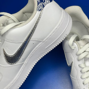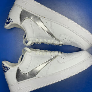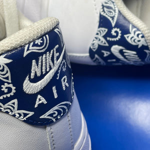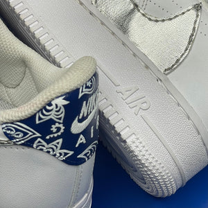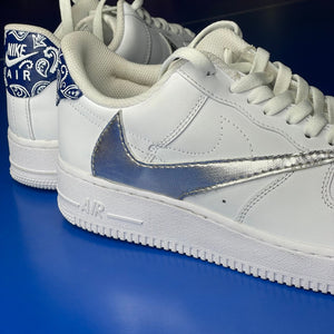 Each hand-stitched silver leather reverse swoosh is inspired by Travis Scott Jordans, while the blue and white bandana on the backtab are added elevate your sneaker game with this AF1.