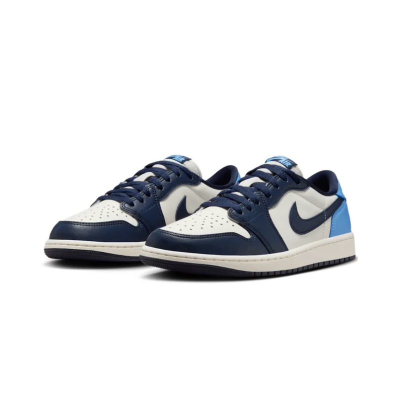 The Jordan 1 Low OG Obsidian UNC brings back a color scheme inspired by Michael Jordan’s alma mater, the University of North Carolina. Featuring an all-leather upper, this low-top iteration mirrors the beloved AJ1 High "Obsidian" with obsidian overlays, a university blue heel, and a sail base for a clean yet bold contrast. The timeless silhouette is finished with Nike Air branding on the tongue and the iconic Wings logo on the heel, staying true to its heritage.