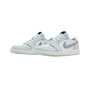 This version of the Jordan 1 Retro Low OG is made with a base of white leather, which forms the side panels and the toe box, which features perforations designed for increased air flow . Photon Dust gray leather overlays form the mudguard, toe cap, eyestays, heel collar, and heel counter, and these have a slight sheen to them like snakeskin. The Nike swooshes that appear on each side are made from gray ripstop material to resemble the texture of snakeskin. A multicolor Air Jordan logo is seen on the heel, and a black logo patch is seen on the tongue.