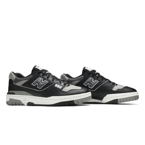The New Balance 550 Shadow features a black and grey leather upper with mesh paneling around the collars. A puffed New Balance logo and "550" branding on the quarter panels nods to the origins of New Balance's basketball line. At the base, a white midsole with a black and grey outsole completes the design.