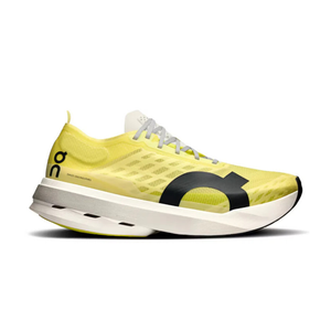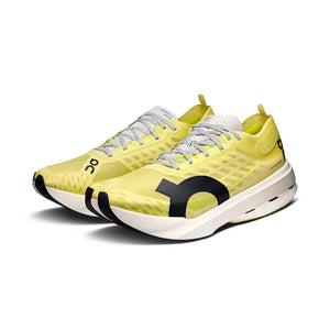 The On Running Cloudboom Strike Limelight Wolf is a high-performance racing shoe built for maximum speed and efficiency, designed to meet the demands of elite marathoners and serious competitors. Its upper features a translucent, ultra-lightweight mesh in a vibrant limelight yellow, accented by tonal overlays and a soft grey "Wolf" hue that lines the collar and heel for subtle contrast. The minimal construction enhances breathability while maintaining a race-ready lockdown fit, supported by precision-placed reinforcements around the midfoot and toe box. The midsole showcases a powerful blend of Helion™ HF hyper foam and a carbon-infused Speedboard®, strategically tuned to deliver aggressive propulsion and energy return during high-tempo efforts. Underfoot, the outsole incorporates a segmented rubber pattern that optimizes grip and flexibility, especially useful for varied road surfaces. With its rocker geometry and stripped-down aesthetic, the Cloudboom Strike offers an explosive ride designed for chasing PRs, making it an ideal choice for long-distance racers who prioritize lightweight responsiveness and race-day focus.