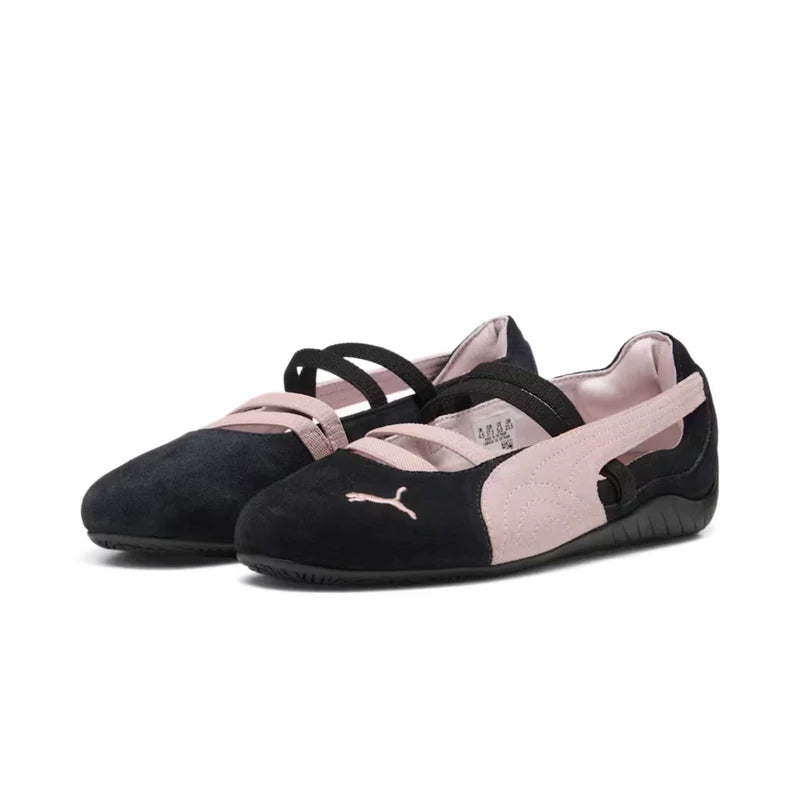 The Puma Speedcat Ballet Black Mauve Mist (W) delivers a sleek, motorsport-inspired silhouette with an elegant, feminine twist. Its upper features a smooth black base crafted from premium synthetic suede, offering a refined texture and streamlined look, accented by subtle Mauve Mist detailing that adds a soft contrast. The low-profile design hugs the foot for a glove-like fit, while a lightly cushioned insole ensures everyday comfort. Signature Puma branding on the lateral side and tongue highlights its racing heritage, and the slim rubber outsole with a rounded driver’s heel provides excellent pedal feel and grip. This design blends sporty aesthetics with a minimalist, fashion-forward edge, making it versatile for casual and lifestyle wear.