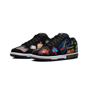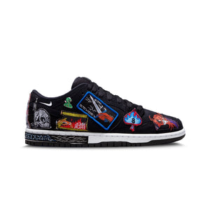 The Nike Dunk SB Low Pro QS Neckface is a sneaker with a mix of black and white as the primary colors, featuring a distinctive design. The shoe's black nubuck uppers are adorned with various patches that showcase Neckface's expressive and unique visual style.