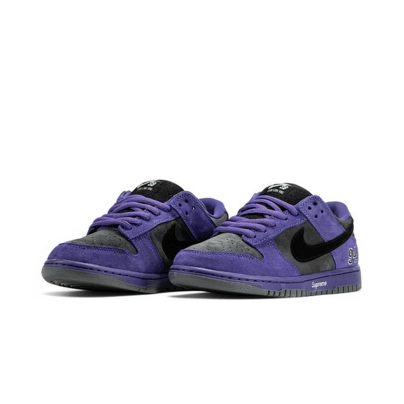 The Nike SB Dunk Low Supreme 94 Ink carries a bold streetwear aesthetic that fuses skateboarding heritage with Supreme’s signature edge. The upper is built with smooth leather in a deep ink shade, contrasted by crisp white overlays that sharpen the silhouette and give it balance. Perforations across the toe box add breathability, while the padded tongue and collar ensure comfort and stability for skate sessions or casual wear. Branding is highlighted through the iconic Swoosh on the sidewalls and subtle Supreme details that mark the collaboration, delivering a premium finish. Underfoot, a classic Dunk sole unit combines a sturdy midsole with a grippy rubber outsole, offering both cushioning and traction. The overall design stands out as a fusion of sport functionality and lifestyle fashion, making it a statement piece in the SB Dunk lineup.
