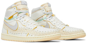 The iconic Union LA x Bephie's Beauty Supply x Air Jordan 1 Retro High OG SP "Summer of '96" is presented in a muted yellow, black and white colorway, featuring premium leather construction with classic tag logos on the panels. The perfect blend of classic style and modern comfort.