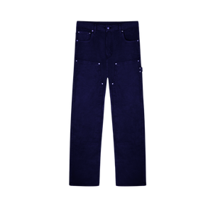 Introducing Navy Minimal Carpenter Pants in navy, a luxury pair of carpenter pants with a relaxed fit, crafted from soft and medium weight cotton twill. The bottoms have metal trims and carpenter details, with a brand logo to the rear pocket in grey detail.