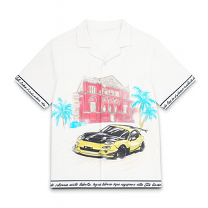 The Libertà Racer Shirt is a premium 100% polyester Cuban collar masterpiece with an oversized fit and silky hand feel, designed to transport you into vacation mode; the front boasts a dynamic racing car speeding past a luxurious hotel, symbolizing high-speed escapes, while the back features a serene palm tree backdrop paired with the evocative Italian text “Sotto le palme, il mare canta libertà, ogni respiro è vita,” capturing the essence of ocean whispers and boundless living—perfect for those ready to fly as fuck from routine to pure, breathable freedom.