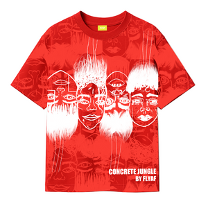 The Static Jungle Tee, available in bold red and sleek blue on butter-soft 100% cotton with an oversized fit, electrifies the concrete jungle narrative through human faces oriented upward and downward, their hair wildly flying with static energy that mirrors the frenetic pulse of city dwellers trapped in urban frenzy— a super-premium piece that invites you to feel the raw, charged essence of metropolitan life while flying as fuck above the chaos.