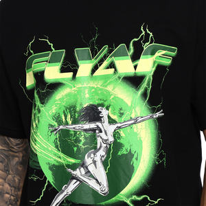 Unleash your futuristic energy with the FLYAF “World Is Your Oyster” Tee. Featuring a high-voltage graphic of a chrome-figure leaping through a glowing green Earth orb, this design is a bold fusion of cyberpunk and streetwear.