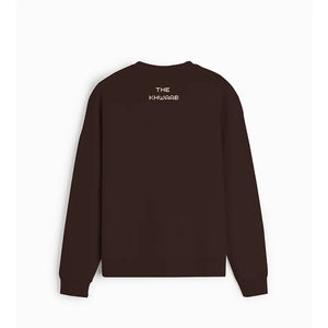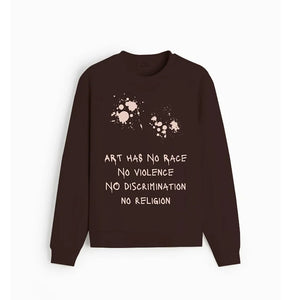 Crewneck sweatshirt in brown cotton fleece with dripping paint and text.