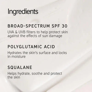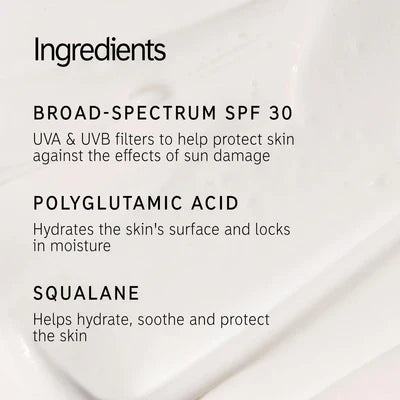 This broad-spectrum SPF 30 sunscreen offers effective UVA and UVB protection while being suitable for all skin tones. Its lightweight formula seamlessly blends into the skin, leaving an undetectable, dewy finish. Infused with an 8% hydration trio of Polyglutamic Acid, Glycerin, and Squalane, it locks in moisture for an ultra-hydrating boost. The non-greasy, non-pilling texture ensures smooth, primed skin, making it an ideal base for makeup or a natural look.