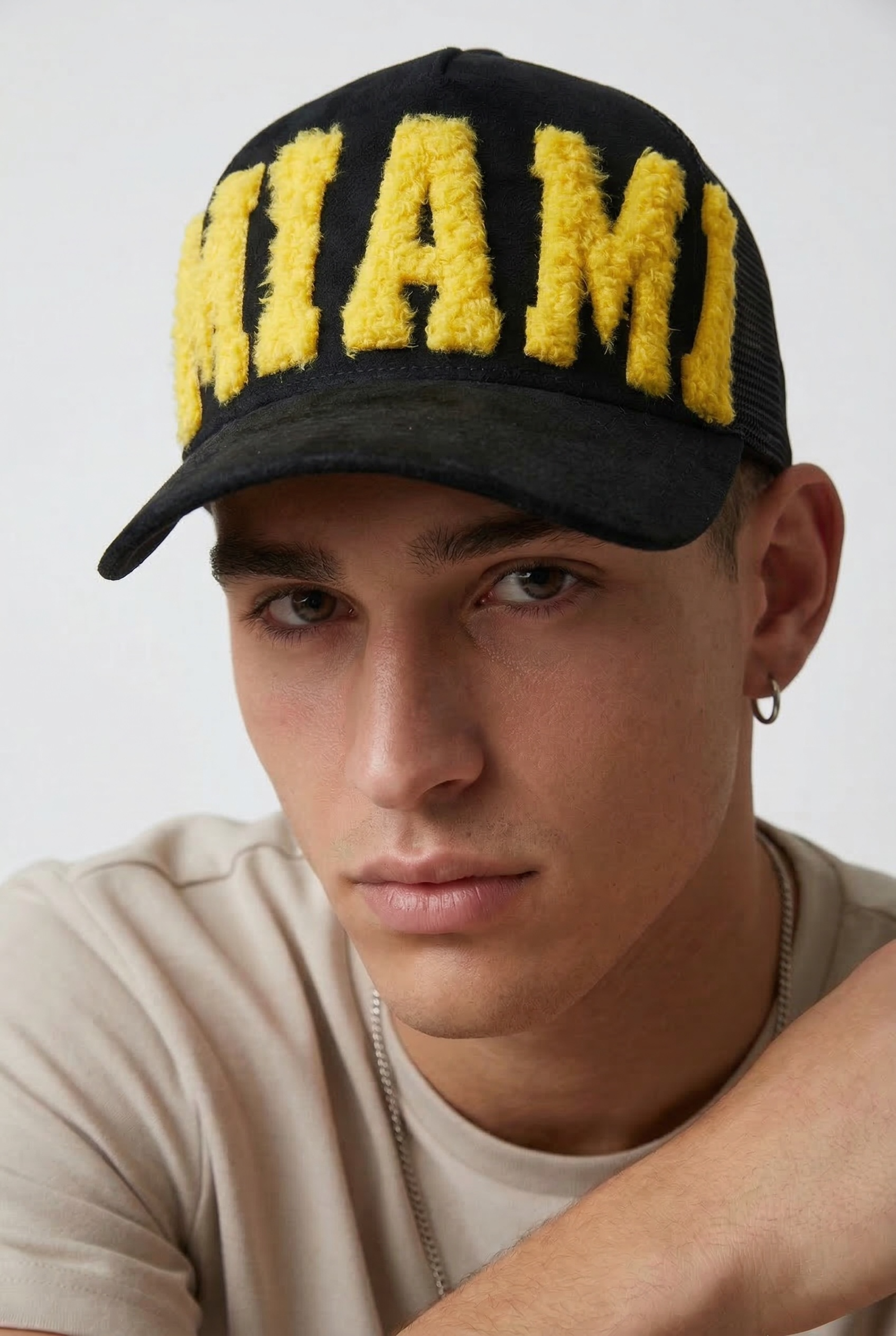 Suede Trucker Cap with MIAMI Fur Embroidery Patch. This 5 panel A-shape gives a stylish fit. Unique Fur Embroidery is the Hero of this premium Black suede cap and will catches the eyes around.
