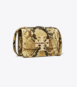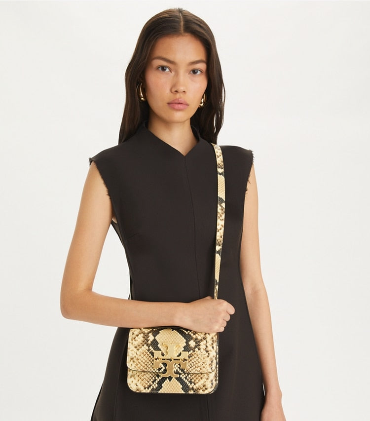 Snake-embossed leather contrasted with smooth hardware, against the clean lines of a box bag. A jewel of craftsmanship, the Small Eleanor Bag is designed to carry with ease. Wear the leather strap over the shoulder or crossbody.