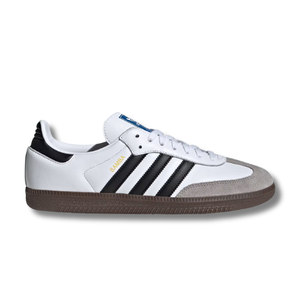 The adidas Samba OG Cloud White Core Black brings a clean, heritage-driven look built on smooth white leather that forms the shoe’s classic low-profile shape, paired with soft suede overlays on the toe that add texture and structure. The black 3-Stripes and matching heel tab create a sharp contrast against the white base, giving the silhouette its instantly recognizable identity, while the refined stitching and gold “Samba” lettering add subtle depth. A lightly padded tongue and collar keep the fit comfortable, and the thin, flexible midsole maintains that signature close-to-ground feel. Underfoot, the caramel-toned gum outsole provides reliable traction with its classic pivot-point pattern, blending everyday function with vintage charm. The overall design captures the timeless essence of the Samba—crisp, minimal, and effortlessly versatile