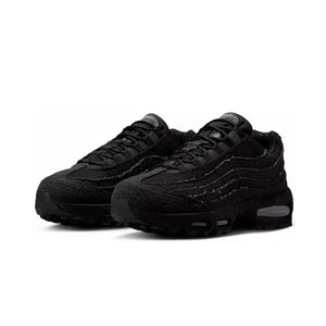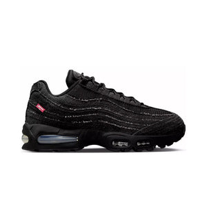 The Nike Air Max 95 OG Levis Black fuses heritage denim-inspired craftsmanship with the iconic lines of Sergio Lozano’s 95 silhouette. A moody Black/Anthracite upper is layered with rugged textile and suede-like textures that echo Levi’s workwear roots, punctuated by Gym Red accents along the eyelets, Swoosh, and branding hits for a sharp, urban finish. The signature wavy side panels create depth and movement, while reflective touches enhance low-light visibility. Underfoot, visible Max Air units in the heel and forefoot keep every step cushioned and responsive, supported by a sculpted foam midsole and a durable rubber outsole engineered for dependable traction on city streets. Balancing utility and style, this men’s Air Max 95 delivers all-day comfort without compromising its street-ready presence. The padded collar and breathable mesh tongue help regulate airflow, while rope laces and reinforced eye stays provide a secure, adaptable fit. Subtle Levi’s nods pair effortlessly with everyday staples, think black denim, utility jackets, and technical outerwear, making this colorway a versatile anchor for any rotation. Noted by style code HM4743-001, the Nike Air Max 95 OG Levis Black stands out as a refined blend of culture, comfort, and craftsmanship that elevates the legendary Air Max lineage. Our team loves this product because it pairs iconic Air cushioning with rugged, denim-inspired detailing, making it perfect for daily wear, long days on your feet, and polished street style.
