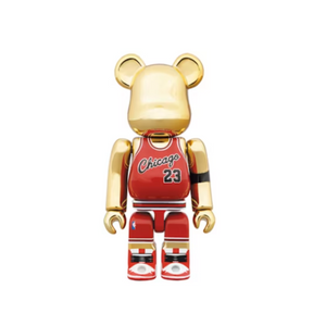 The Bearbrick Michael Jordan 1985 Rookie Jersey 100% & 400% set features two identical gold chrome colored Bearbricks that pay homage to Michael Jordan's rookie year with the Chicago Bulls. The set features two completely gold Bearbricks wearing the Chicago Bulls' home uniform from the 1985 season. The Bearbricks are wearing Jordan 1 Chicago's on feet, and feature a black sweatband on the left arm, just like MJ wore throughout his career.