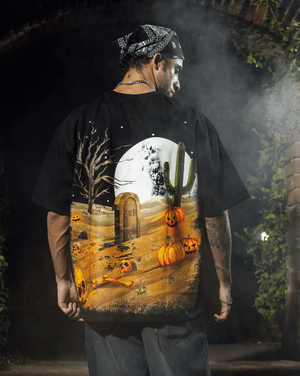 This Halloween-inspired t-shirt is designed for those who embrace the darker side of style. The spooky elements bring the chilling spirits of Halloween to life while the desolate desert adds an extra layer of mystery