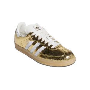 The Samba OG 'Cracked Metallic Pack - Gold' blends classic design with a modern metallic finish for a distinctive look. Crafted for durability and comfort, its iconic silhouette is enhanced by a cracked gold metallic overlay, giving it a premium, textured aesthetic. This sneaker offers reliable grip and support, making it ideal for both casual wear and active use. A sophisticated choice for those seeking a blend of timeless style and subtle, eye-catching detail.