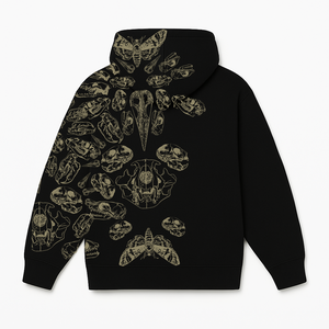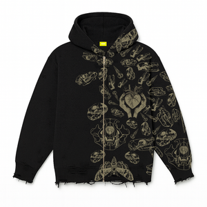 Dive into darkness with this black zipper hoodie, featuring intentional distressing along the bottom rib hem and sleeve cuffs for a raw, lived-in edge. The central motif depicts two hands clutching a heart, encircled by an intricate array of bones, skulls, and butterflies – symbols of fragility, transformation, and eternal cycles.