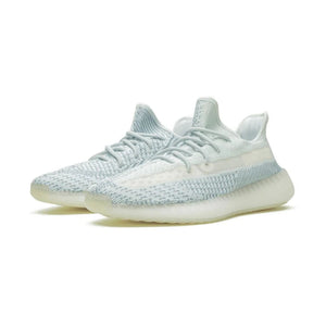 The adidas Yeezy Boost 350 V2 Cloud White (Non-Reflective) presents a soft and versatile aesthetic, pairing the sleek silhouette with airy, understated tones. Its Primeknit upper is woven in a mix of white and pale grey shades, creating a cloud-like pattern that feels both subtle and modern. A translucent monofilament side stripe runs across the lateral side, adding texture while maintaining the minimalist design language. The sock-like build ensures a snug yet flexible fit, complemented by rope-style laces that blend seamlessly into the upper. Underfoot, the signature ribbed midsole encases responsive Boost cushioning, delivering lightweight comfort and long-lasting energy return. A semi-translucent rubber outsole rounds out the look with dependable grip, making this iteration a calm and wearable take on the Yeezy 350 V2 line.